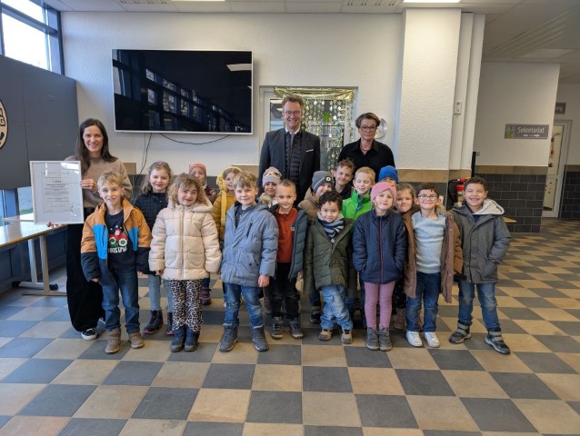 Besonders erfreulich ist der großartige Erfolg der Klasse 1a: Von insgesamt 78 teilnehmenden Klassen aus dem gesamten Kreis Olpe erreichte sie einen hervorragenden 2. Platz. Für diese tolle Leistung wurde die Klasse von Bürgermeister Herrn Puspas sowie Frau Menn von der Klimaagentur im Kreis Olpe e.V. geehrt.